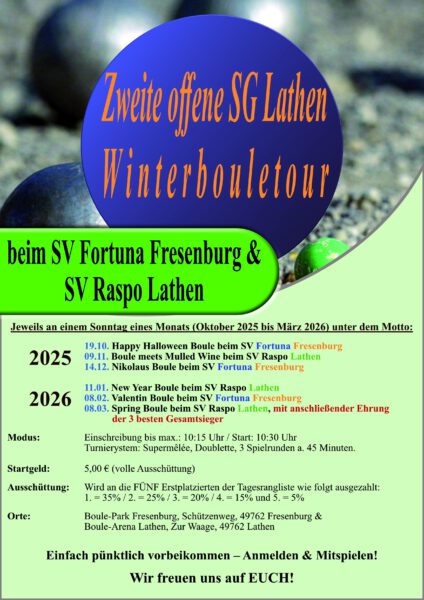 Schön, dass Ihr den Weg zu Emslandboule gefunden habt. Informiert Euch gerne auf unseren Seiten über Emslandboule, über Erfolge, Veranstaltungen, den Spielbetrieb und vieles mehr.